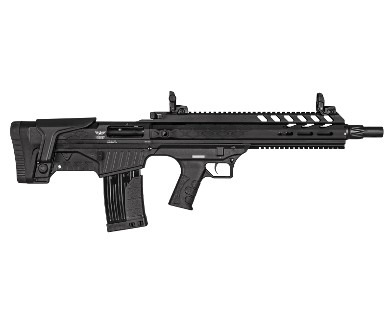 The BPX 902 Shotgun is gas operated and features 18.50″ with 3 chokes. I also has a bullpup stock, folding front & rear sights, sling swivel, and comes with two 5-round and one 2-round magazines.